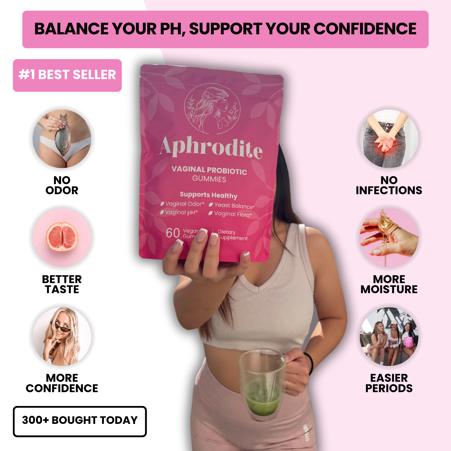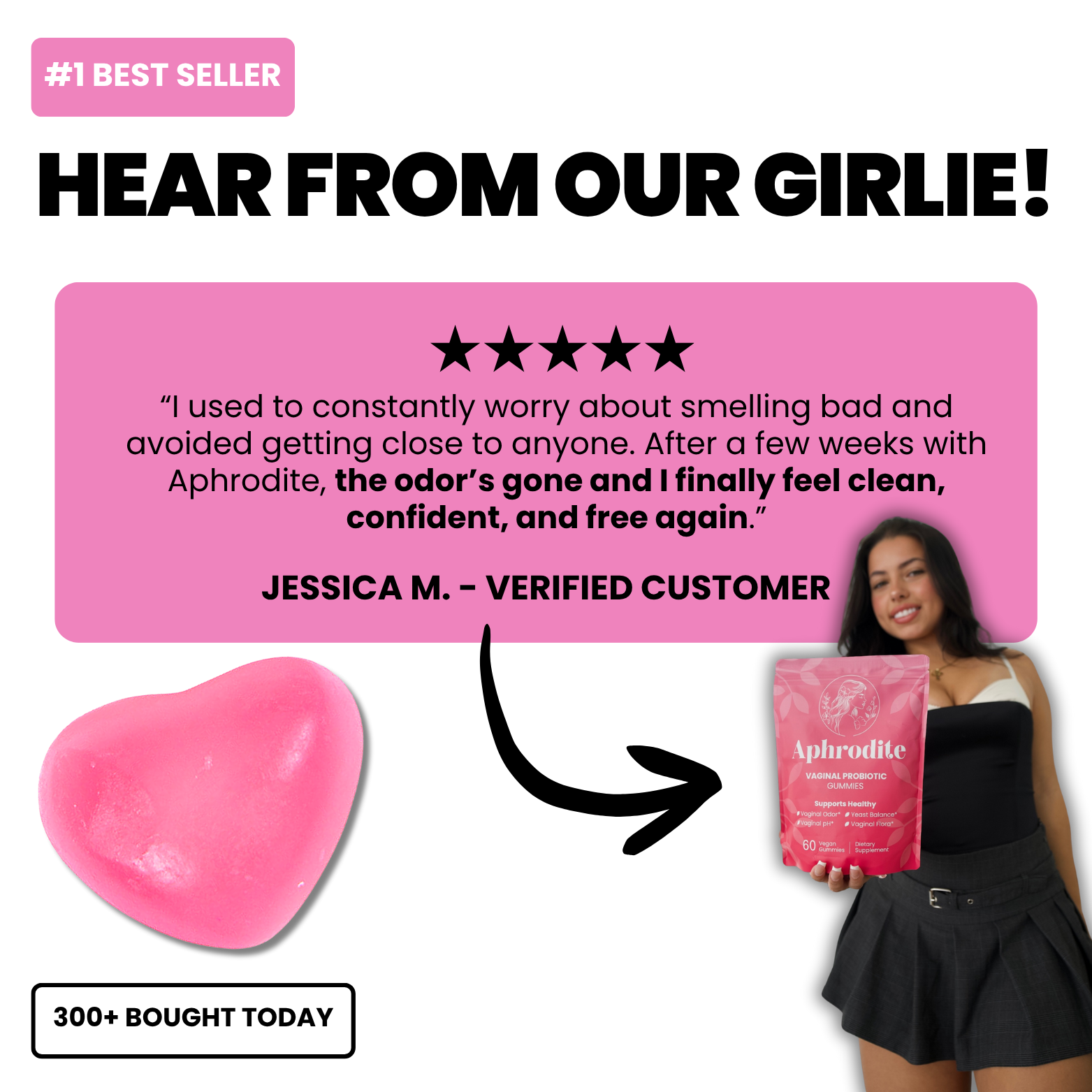 Aphrodite combines clinically-backed probiotics, natural herbs, and sweet-tasting gummies — designed specifically for vaginal balance, odor elimination, and daily freshness. No pills, no awkward treatments — just a delicious routine you’ll actually look forward to.